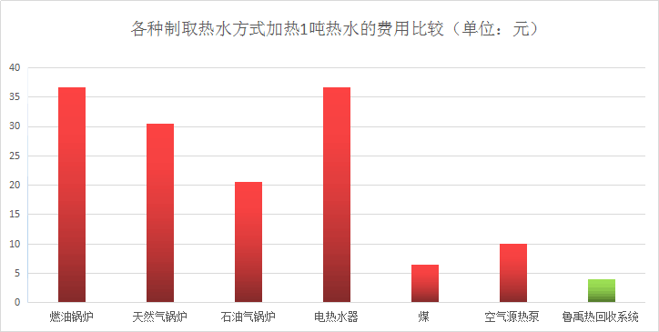 一般淋浴頭噴出洗浴熱水的溫度在40度左右,經(jīng)人體從頭到腳流到下水井的廢水溫度在35度左右,這些熱量被白白的浪費(fèi)扔掉。而同樣的廢水經(jīng)過魯禹熱回收機(jī)組再排放時(shí)的溫度只有3-5度。35減去5度這就意味著有30度的熱能留在了機(jī)組里,在把14度左右的新鮮冷水引進(jìn)機(jī)組里,14度加上30度等于44度,(注意!只是回收熱量不是回收水。魯禹熱回收系統(tǒng)加熱1噸熱水的運(yùn)營(yíng)成本只需4度電,比電加熱節(jié)省75%以上電費(fèi),比燃煤、燃?xì)忮仩t節(jié)省50%以上運(yùn)行成本。