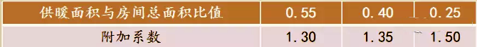 6、局部地面輻射供暖系統(tǒng)熱負(fù)荷,可按整個(gè)房間全面輻射供暖所算得的熱負(fù)荷乘以該區(qū)域面積與所在房間面積的比值和下表中所規(guī)定附加系數(shù)確定。