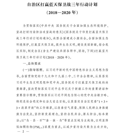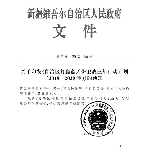 新疆維吾爾自治區(qū)人民政府發(fā)布了關(guān)于印發(fā)《自治區(qū)打贏藍(lán)天保衛(wèi)戰(zhàn)三年行動計劃(2018-2020年)》的通知