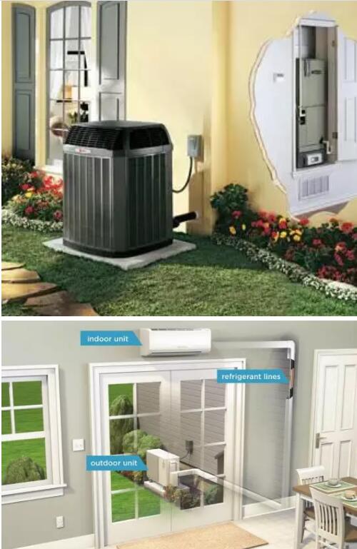 (空氣源熱泵系統(tǒng)包括一個室外單元,包含一個風機,室外盤管,壓縮機和膨脹閥,以及一個包含室內(nèi)盤管和風扇的室內(nèi)機。