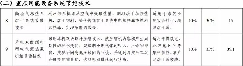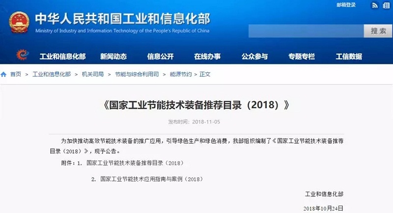 2018年11月5日,工業(yè)和信息化部發(fā)布《國家工業(yè)節(jié)能技術裝備推薦目錄(2018)》公告,其中“高溫氣源熱泵烘干系統(tǒng)節(jié)能技術、單機雙級螺桿型空氣源熱泵機組節(jié)能技術”兩項空氣源熱泵技術、案例成功入選《國家工業(yè)節(jié)能技術裝備推薦目錄(2018)》及《國家工業(yè)節(jié)能技術應用指南與案例(2018)》。