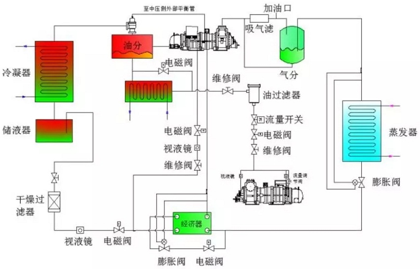 2.技術原理及工藝單機雙級螺桿壓縮超大型空氣源熱泵機組是一種基于逆卡諾循環(huán)原理建立起來的節(jié)能、環(huán)保、制熱高效、集熱并轉(zhuǎn)移熱量的裝置。采用單機雙級螺桿壓縮技術,使壓縮機內(nèi)容積產(chǎn)生周期性的容積變化,完成制冷劑氣體的吸入、壓縮和排出,實現(xiàn)不同高低壓級間的互換,并通過與實際工況合理搭配排量比,達到機組最優(yōu)運行狀態(tài)。系統(tǒng)原理圖如下:
