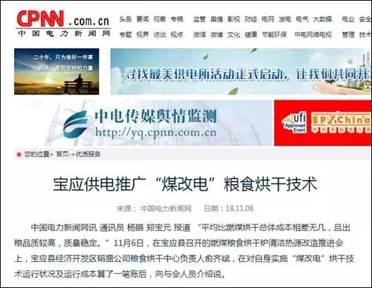 中國電力新聞網(wǎng):推廣“煤改電”糧食烘干