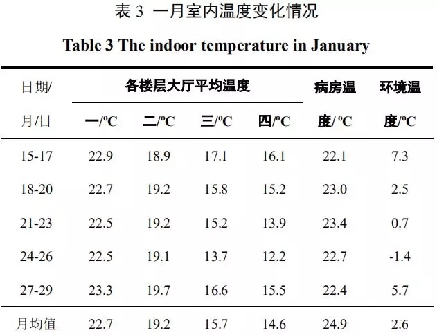 如下表3所示,室外平均干球溫度2.64℃,一/二/三/四樓大廳月平均溫度分別為22.7℃、19.2℃、15.7℃和14.6℃。其中,高樓層大廳用戶窗常開,導(dǎo)致三/四樓大廳室內(nèi)溫度偏低。各樓層病房月平均溫度為:24.9℃。病房人員日間習(xí)慣窗戶微開,保持室內(nèi)空氣流通,故日間室內(nèi)溫度存在小范圍波動,室內(nèi)溫度基本不低于20℃。