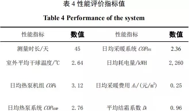 對各采集數(shù)據(jù)綜合分析,整個冬季采暖測試時間:2016年1月19日~3月4日,共45天?傮w性能指標(biāo)如下表4所示,采暖周期內(nèi)平均結(jié)霜系數(shù)為0.96。其中,共有四天結(jié)霜天氣(分別為:1月28日、1月29日、1月31日和2月1日)在換熱器翅片表面有結(jié)霜,結(jié)霜系數(shù)分別為0.96、0.94、0.97和0.98。