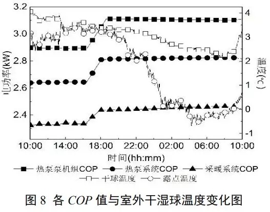如圖8所示,結(jié)霜工況下(29日10:00-16:30),系統(tǒng)進(jìn)入間歇啟停模式,熱泵機(jī)組COPH下降,均值為2.89。當(dāng)系統(tǒng)結(jié)束化霜進(jìn)入普通模式后(29日18:00-30日11:00),各COP值上升,系統(tǒng)開始正常運行。