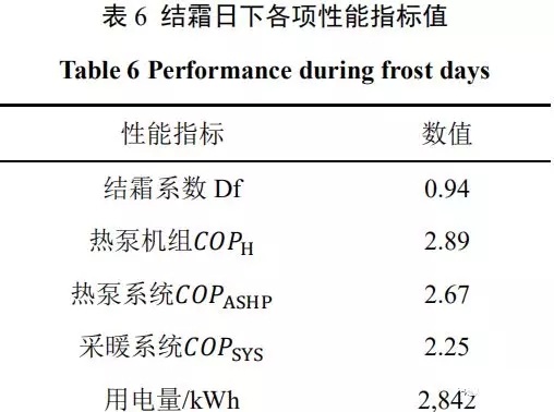 本文選取典型結(jié)霜日(1月29日10:00~1月30日11:00),對熱泵機(jī)組在結(jié)霜環(huán)境下工況做進(jìn)一步分析。結(jié)霜工況下各項性能指標(biāo)平均值如表6所示: