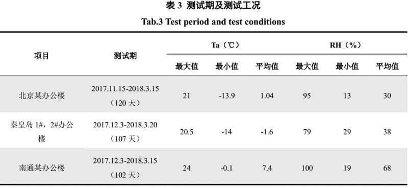 四個(gè)測(cè)試項(xiàng)目位于不同的氣候區(qū),測(cè)試工況特點(diǎn)不同。北京和秦皇島位于寒冷地區(qū),采暖季室外溫度較低,其平均室外溫度分別為1.04℃和-1.6℃。北京地區(qū)除部分雨雪天氣室外相對(duì)濕度較大外,供暖季整體室外工況較為干燥,相對(duì)濕度平均值僅為30%,秦皇島地區(qū)相對(duì)濕度穩(wěn)定較低,維持在平均值38%左右波動(dòng)。南通位于夏熱冬冷地區(qū),室外溫度相對(duì)較高,平均值為7.4℃,室外相對(duì)濕度較大,測(cè)試期間 2/3天數(shù)的日平均相對(duì)濕度高于70%,相對(duì)濕度的均值為68%。具體的測(cè)試時(shí)間以及日平均室外溫濕度基本信息如表3所示。