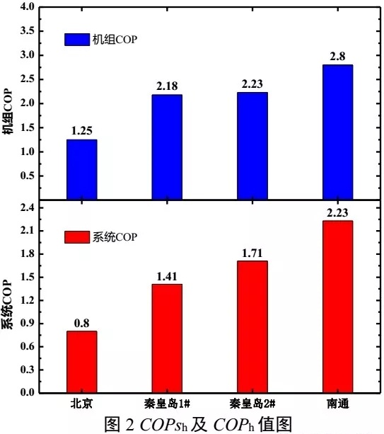 COPsh值更是顯著降低,北京某辦公樓的COPsh值僅為0.8,秦皇島1#辦公樓、2#辦公樓COPsh值分別為1.41、1.71,南通某辦公樓由于COPh值相對(duì)較高,COPsh值達(dá)到了2.23。可見,調(diào)查的4個(gè)綠色建筑空氣源熱泵系統(tǒng)實(shí)際運(yùn)行效果不佳。