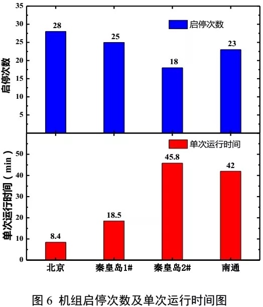 圖6為各項(xiàng)目空氣源熱泵機(jī)組啟停次數(shù)以及機(jī)組平均單次運(yùn)行時(shí)長(zhǎng)。北京某辦公樓、秦皇島1#辦公樓、2#辦公樓、及南通某辦公樓項(xiàng)目機(jī)組每日啟停次數(shù)分別為28次、25次、18次、23次,機(jī)組平均單次運(yùn)行時(shí)長(zhǎng)分別為8.4min、18.5min、45.8min、42min?梢,實(shí)際運(yùn)行中空氣源熱泵系統(tǒng)存在機(jī)組啟停頻繁問題,北京某辦公樓、秦皇島1#辦公樓項(xiàng)目機(jī)組單次運(yùn)行時(shí)長(zhǎng)過短,嚴(yán)重影響機(jī)組性能和供暖效果。