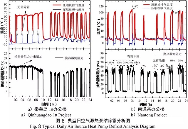圖8為秦皇島1#辦公樓及南通某辦公樓典型日結(jié)除霜分析圖,由圖可得,秦皇島1#辦公樓空氣源熱泵機(jī)組在典型日機(jī)組發(fā)生除霜8次除霜,但其室外換熱器阻力并未增加,8次除霜均為“無霜除霜”事故,典型日內(nèi)誤除霜概率高達(dá)100%。南通某辦公樓空氣源熱泵就典型日發(fā)生除霜14次,其中換熱器阻力增加超過40%的“有霜不除”事故7次,壓縮機(jī)排氣溫度最高達(dá)114℃,接近120℃報(bào)警閾值,嚴(yán)重影響機(jī)組運(yùn)行穩(wěn)定性。換熱器阻力增加不足15% 的“無霜除霜”3次,誤除霜概率高達(dá)70%。