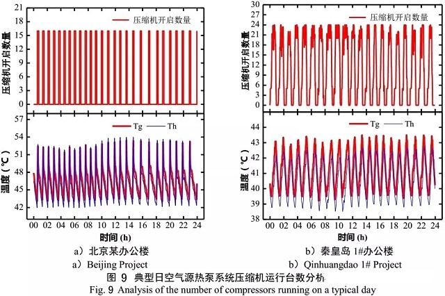 圖9為典型日北京、秦皇島1#辦公樓項(xiàng)目空氣源熱泵系統(tǒng)壓縮機(jī)運(yùn)行臺(tái)數(shù)變化圖,北京某辦公樓項(xiàng)目空氣源熱泵系統(tǒng)無群控策略,機(jī)組根據(jù)回水溫度機(jī)組同啟同停。