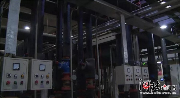 24日上午9時30分左右,在河北某大學的校園內(nèi)操場附近,一處鐵絲網(wǎng)圍起來的區(qū)域內(nèi),沿著通往地下室的樓梯進入污水源熱泵機房,一排排大型的灰色的管道和控制箱赫然入目。