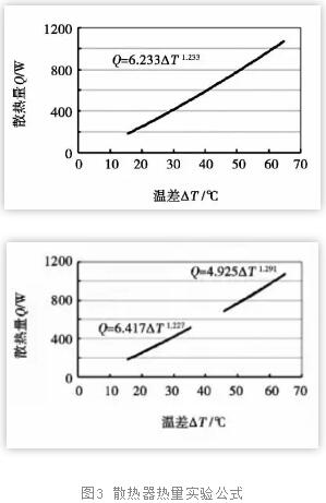 風機盤管冷暖兩用,供水溫度可降低,用于住宅供暖時宜立式安裝,宜靠外窗設(shè)置。散熱器用于空氣源熱泵供暖系統(tǒng),熱媒溫度可降低與熱水供應(yīng)溫度55℃一致。其散熱量計算完全可按各類散熱器給出的實驗公式,代入ΔT℃進行計算即可。圖3是對同一組散熱器分別對溫差ΔT=15℃~65℃進行分段實驗和連續(xù)實驗的結(jié)果,低溫工況的散熱量可視為ΔT=40℃~65℃試驗曲線的延長線。