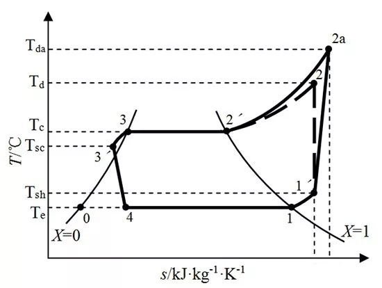過熱的高溫氣體2進(jìn)入冷凝器放熱,在壓力基本不變的情況下,到達(dá)2’點(diǎn),即工質(zhì)氣體飽和點(diǎn)。