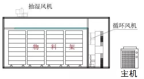 熱泵烘干系統(tǒng)包括空氣源熱泵主機(jī)、烘干房內(nèi)循環(huán)風(fēng)機(jī)、風(fēng)道和勻風(fēng)板、物料架以及托盤等部分構(gòu)成。