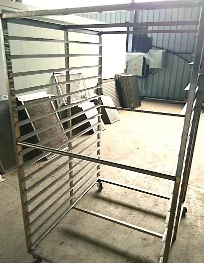 移動(dòng)式物料架,移動(dòng)式貨架一般采用推車的形式,將物料架和輪式推車固定在一起,主要適用于大中型烘干房,烘干量一般都比較大,要求鋪裝物料要方便而且是多人同時(shí)操作,使用時(shí)在工作臺(tái)上進(jìn)行物料擺放,將物料擺放好放置于推車上,物料擺放完畢一起推入烘干房。