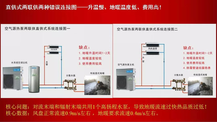 首先,空氣源高效兩聯(lián)供和低效兩聯(lián)供的主要區(qū)別是什么?經(jīng)差異化實(shí)驗(yàn)對比,主要區(qū)別在于地暖末端結(jié)構(gòu)和連接方式。因?yàn)榇蠹乙睬宄托陕?lián)供就是空氣源熱泵水機(jī)+直供式地暖,所以容易出現(xiàn)問題的地方就是配置的地暖末端系統(tǒng)!