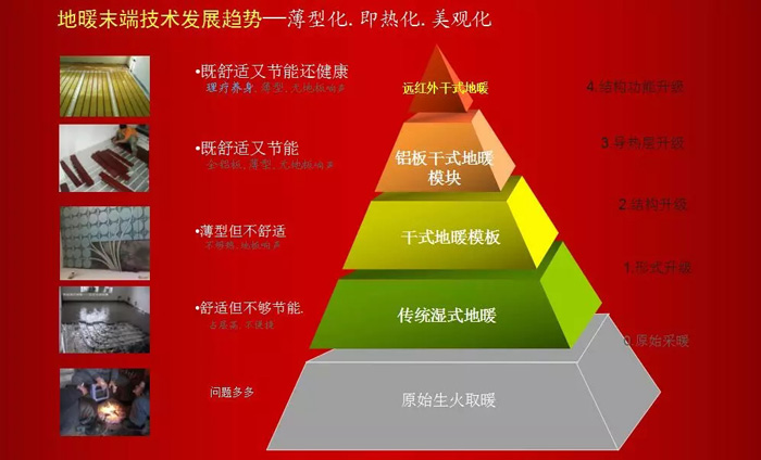 上圖是我做的一個(gè)地暖末端在技術(shù)上的發(fā)展趨勢:薄型化——即熱化——美觀化,這個(gè)大家可以看圖了解一下,具體我就不作解說了。