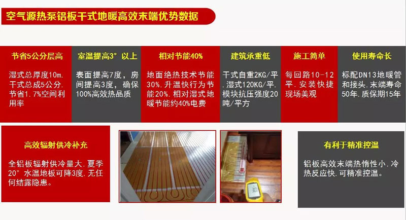 其中,系統(tǒng)標(biāo)配:1)全鋁板干式地暖模塊;2)分水器;3)DN13地暖管;4)專用接頭。這里我做了一個(gè)空氣源熱泵鋁板干式地暖高效末端優(yōu)勢數(shù)據(jù)圖,這個(gè)很寶貴,具體優(yōu)勢大家可以看下圖: