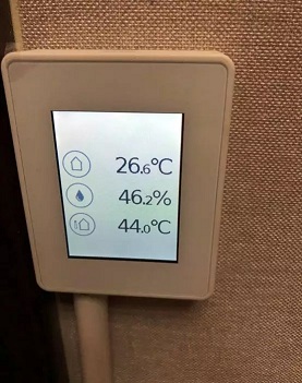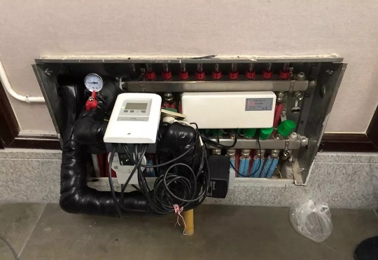 在分集水器前端加裝了混水中心,全自動化調(diào)節(jié)地暖供水溫度,實現(xiàn)氣候補償技術(shù)。室內(nèi)裝有中央控制器,溫濕度露點控制面板,夏季地板可制冷,處理圍護結(jié)構(gòu)負荷,實現(xiàn)露點保護技術(shù)。室外部分PUN601離心泵,影響混水閥出水的準(zhǔn)確度,更換為PUN200離心泵泵,降低外置水泵對混水閥的影響,同時降低了運行能耗。二次側(cè)只用一臺15-8的高效泵負責(zé)末端循環(huán),調(diào)試時分集水器流量計顯示3L/min說明地暖側(cè)水流量充足。