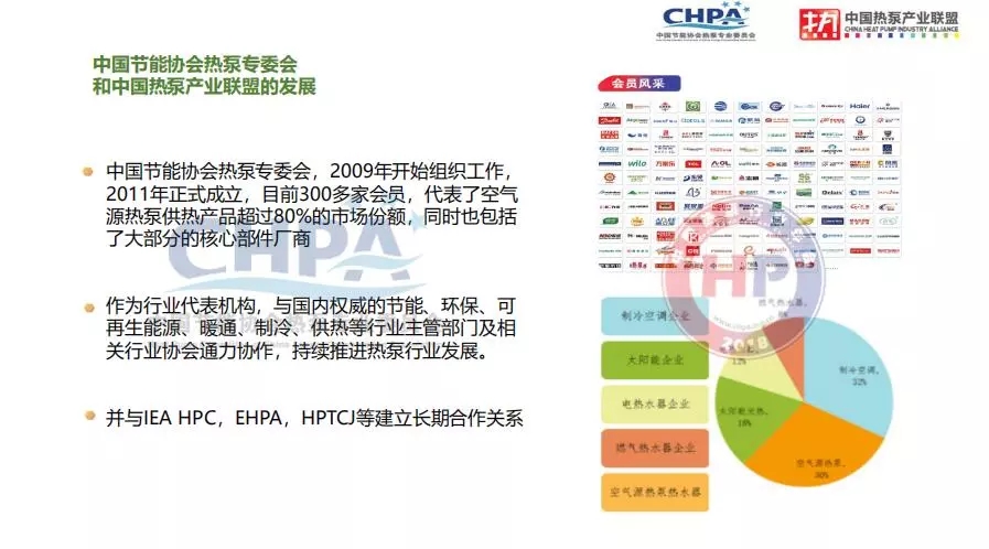 中國熱泵產(chǎn)業(yè)聯(lián)盟于2009年開始在我國熱泵行業(yè)組織與空氣源熱泵產(chǎn)業(yè)相關的工作,2014年8月正式通過民政部批準,注冊為中國節(jié)能協(xié)會熱泵專委會,是中國節(jié)能協(xié)會下設分支機構之一。目前協(xié)會具有300多家會員,代表了空氣源熱泵供熱產(chǎn)品超過80%的市場份額,同時也包括了大部分核心部件廠商。中國節(jié)能協(xié)會熱泵專業(yè)委員會作為行業(yè)代表機構,與國內權威的節(jié)能、環(huán)保、可再生能源、暖通、制冷、供熱等行業(yè)政府主管部門及相關行業(yè)協(xié)會通力協(xié)作,持續(xù)推進熱泵行業(yè)的發(fā)展。與此同時,專委會還與IEA HPC、EHPA、HPTCJ等國際產(chǎn)業(yè)機構建立長期合作關系。
