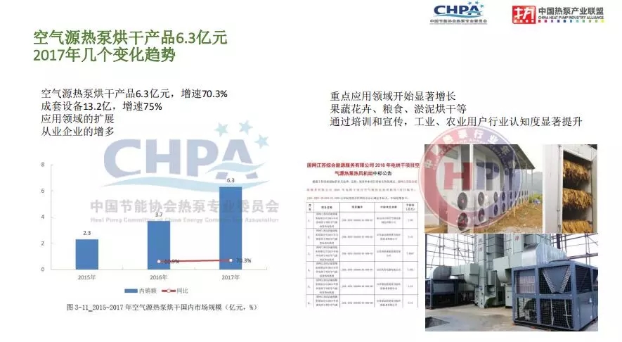 此外,近兩年生活熱水、供暖和工農(nóng)業(yè)烘干三大應用領域在市場總量中所占的市場份額也發(fā)生變化。在供暖市場興起前,生活熱水一直占據(jù)年度產(chǎn)業(yè)總體規(guī)模的最大市場份額,但是2017年空氣源熱泵供暖(包括戶式和商用)產(chǎn)值達到90.4億元,占行業(yè)比例達到52.8%,開始占據(jù)最大份額。在空氣源熱泵供熱產(chǎn)品應用領域增幅方面也出現(xiàn)了變化,2017年生活熱水增幅最小為2.9%,供暖增長達到221.7%,烘干達到70.3%。2017年工農(nóng)業(yè)烘干主機出貨額是6.3億,增速70.3%,成套設備算上烘房,成套設備市場規(guī)模實現(xiàn)13.2億,增速75%。此外烘干市場出現(xiàn)應用領域的擴展,從業(yè)企業(yè)的增多的特點。一些重點應用領域開始顯著增長,包括花卉、糧食、以及玉米烘干等。行業(yè)協(xié)會也正積極通過持續(xù)宣傳培訓來提升工業(yè)和農(nóng)業(yè)用戶對于空氣源熱泵的認知度。