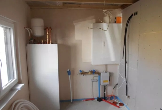 房屋內(nèi)部,設(shè)備間,自來(lái)水、電力、通訊線(xiàn)纜,以及“空氣源熱泵”系統(tǒng)的室內(nèi)主機(jī),安裝現(xiàn)場(chǎng),局部特寫(xiě)。
