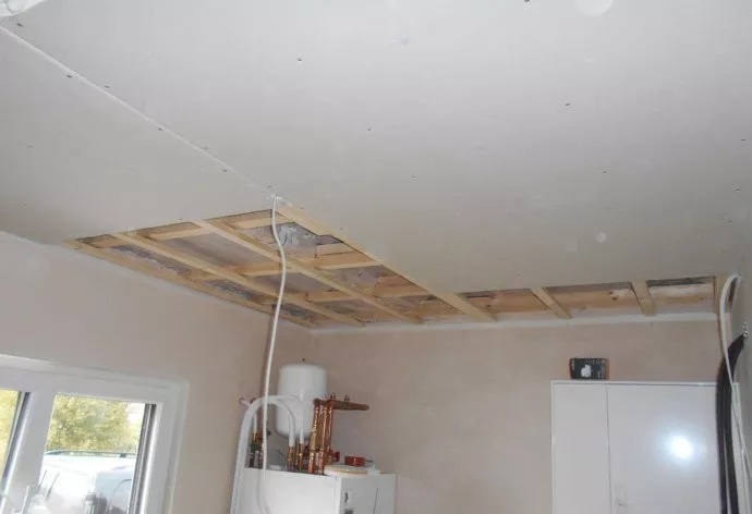 設(shè)備間的內(nèi)部,天花板的底部,石膏板的釘貼,施工現(xiàn)場(chǎng)