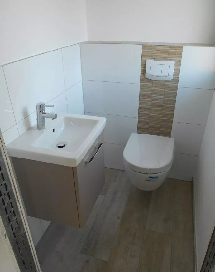 廁所內(nèi)部一瞥,可見(jiàn),安裝有懸掛式坐便器、懸掛式洗面臺(tái)