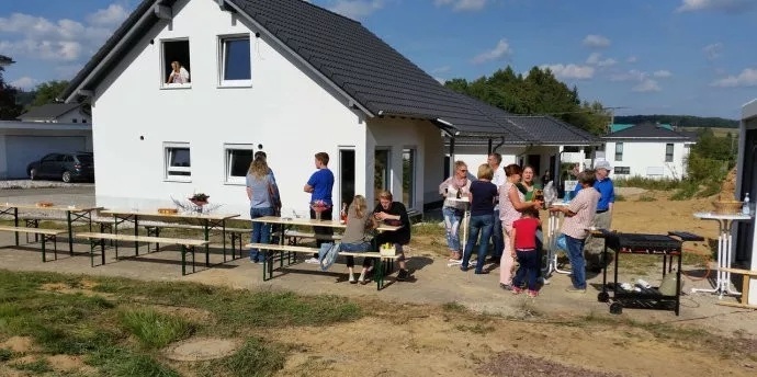 最后附上幾張正在進(jìn)行一項(xiàng)德國(guó)民間風(fēng)俗“封頂儀式”圖片,跟中國(guó)人蓋房風(fēng)俗很像,房子封頂邀請(qǐng)親朋好友、左鄰右舍吃飯慶祝。