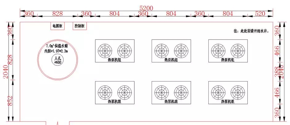 系統(tǒng)二占地面積13m×5.1m,共66.3m2,共布置6臺機(jī)組和1個(gè)7.0m3的保溫水箱,機(jī)組總制熱量為573kW,分別承擔(dān)3、5、9號樓的供熱負(fù)荷。如下圖。