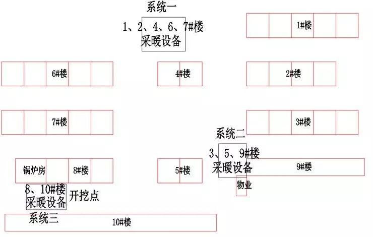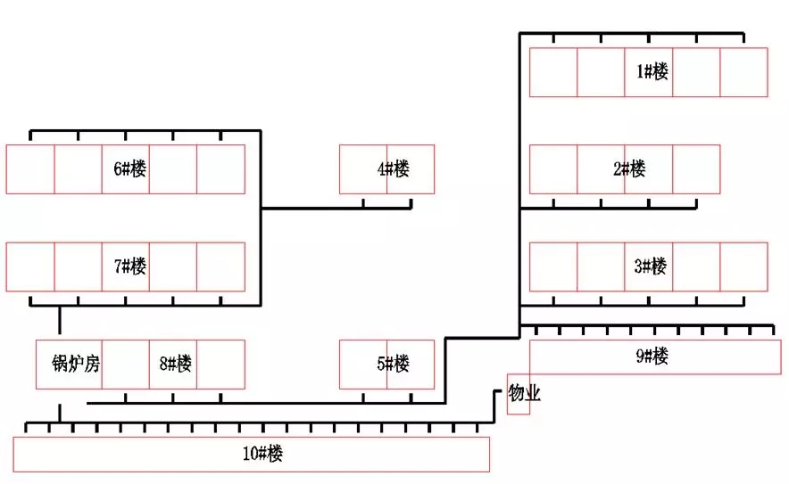 這個(gè)案例在陜西,一共有10棟住宅和物業(yè)管理,1~8號樓為6層,9~10號樓是1~2層,采暖面積一共42900多平,原先在8號樓東南角有一個(gè)燃煤鍋爐房。下圖是鍋爐房原先的管網(wǎng)布置,供暖系統(tǒng)由鍋爐房循環(huán)泵經(jīng)室外管網(wǎng)分別送到各棟樓室內(nèi)的采暖系統(tǒng)。