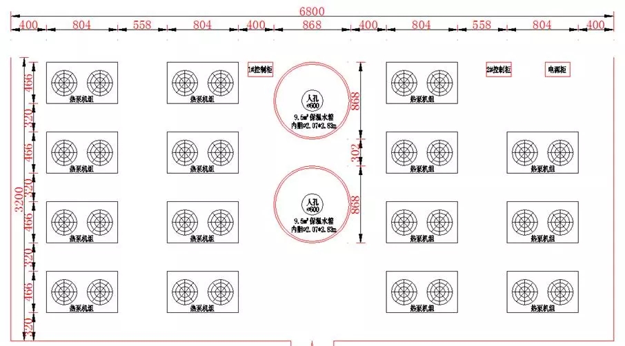系統(tǒng)三占地面積8m×6.5m,共52m2,共布置4臺機(jī)組和1個(gè)5.0m3的保溫水箱,機(jī)組總制熱量為382kW,分別承擔(dān)8、10號樓的供熱負(fù)荷。如下圖。