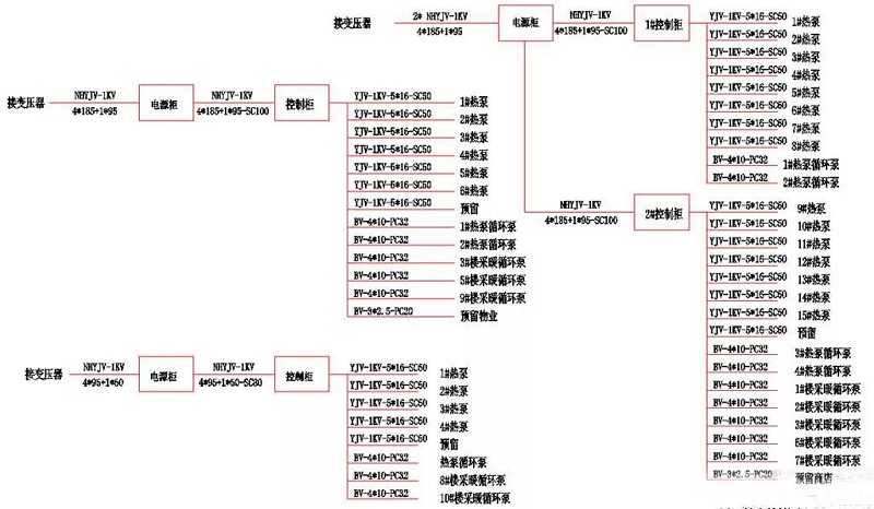這個(gè)方案是想利用原燃煤室外供暖管網(wǎng),將原小區(qū)集中室外管網(wǎng)某部分截?cái)嘁环譃槿,將原室外綜合管網(wǎng)分為10個(gè)獨(dú)立的管網(wǎng),每棟樓通過獨(dú)立管網(wǎng)對應(yīng)的一臺循環(huán)泵,共選用10臺泵,再加上系統(tǒng)一中配置空氣源熱泵機(jī)組至水箱的2臺內(nèi)部循環(huán)泵,共12臺泵。如下圖所示。