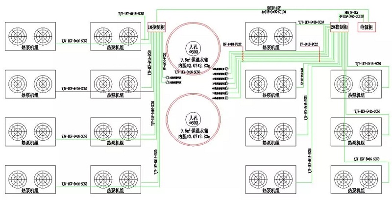這三個(gè)系統(tǒng)集中布置為三塊場地,系統(tǒng)一占地面積17m×80m,共1360m2,共布置15臺機(jī)組和2個(gè)9.5m3的保溫水箱,機(jī)組總制熱量為1432.5kW,分別承擔(dān)1、2、4、6、7號樓的供熱負(fù)荷。如下圖。