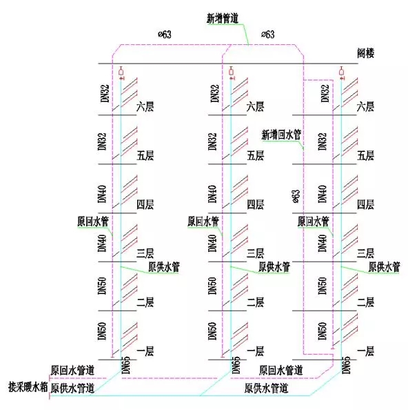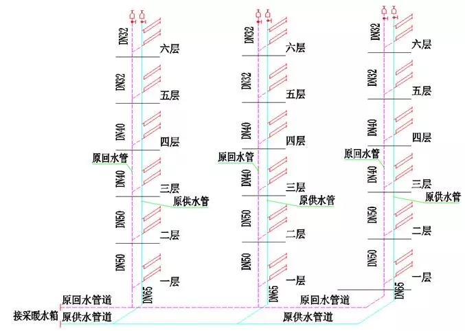 問題剖析:回水管徑存在下大上小,在回水總管從小突然擴(kuò)大,水阻存在問題;為系統(tǒng)同程,特增加回水總管,但管徑隨支管流量增加未能改變回水總管管徑;排氣閥未裝,運(yùn)行不熱。