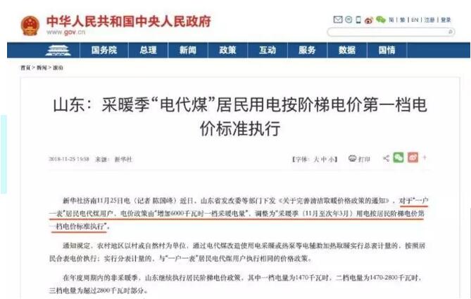 山東發(fā)改委發(fā)布了《關(guān)于完善清潔取暖價格政策的通知》,明確“一戶一表”居民電代煤用戶,采暖季(11月至次年3月)用電按居民階梯電價第一檔電價標準執(zhí)行。工商業(yè)的電代煤項目、居民住宅小區(qū)內(nèi)采用空氣源熱泵電鍋爐等電采暖電輔助加熱取暖項目,按照“清潔取暖用電市場化競價采購”政策執(zhí)行。