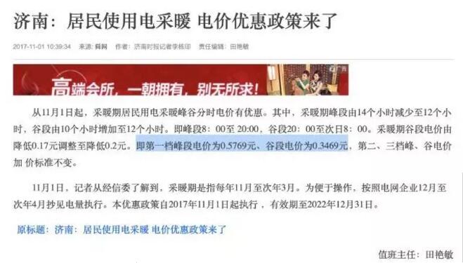 按照山東省政府文件,濟南“一戶一表居民電代煤用戶,采暖季(11月至次年3月)用電按居民階梯電價第一檔電價標準執(zhí)行”。再疊加“采暖期峰段12個小時,谷段12個小時。即峰段8:00至20:00,谷段20:00至次日8:00。采暖期第一檔峰段電價為0.5769元、谷段電價為0.3469元”。