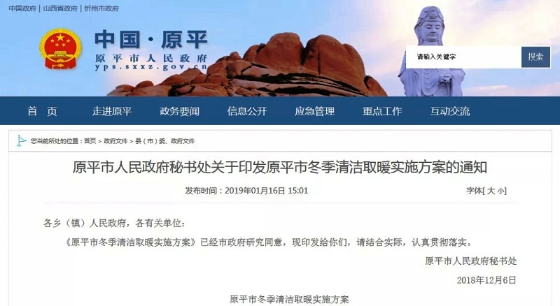 原平市人民政府因地制宜推廣空氣源熱泵電鍋爐天然氣等供暖設(shè)施,盡可能利用清潔能源實現(xiàn)清潔取暖