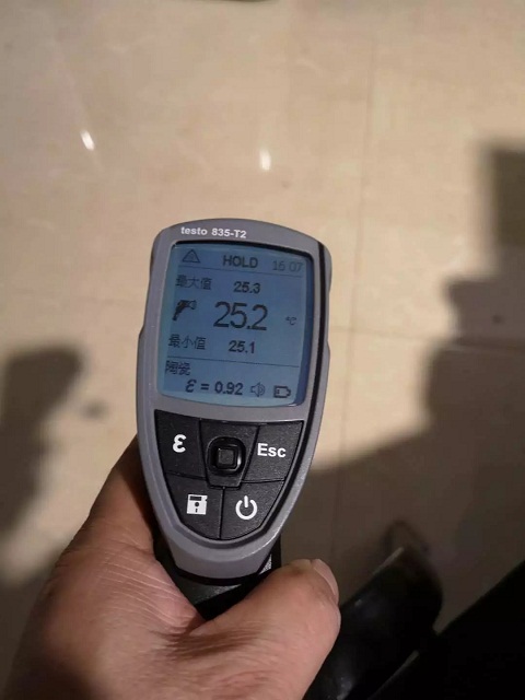 參訪期間,我們還分階段對(duì)別墅內(nèi)每個(gè)房間、每個(gè)角落的溫度進(jìn)行了現(xiàn)場(chǎng)實(shí)測(cè),發(fā)現(xiàn)每個(gè)時(shí)段的溫度都會(huì)有所不同,房間和角落之間的溫差也都控制在1℃范圍以內(nèi),真正感受到二個(gè)房間溫差1℃的明顯不同感受。在室外零下2℃的時(shí)候,木地板房間的室溫23℃時(shí),地板溫度的最大值為27.7℃,最小值為27.5℃,此刻的地磚地面的溫度又是25.2℃,地面溫而不熱,非常舒適的智能化的系統(tǒng)控制。